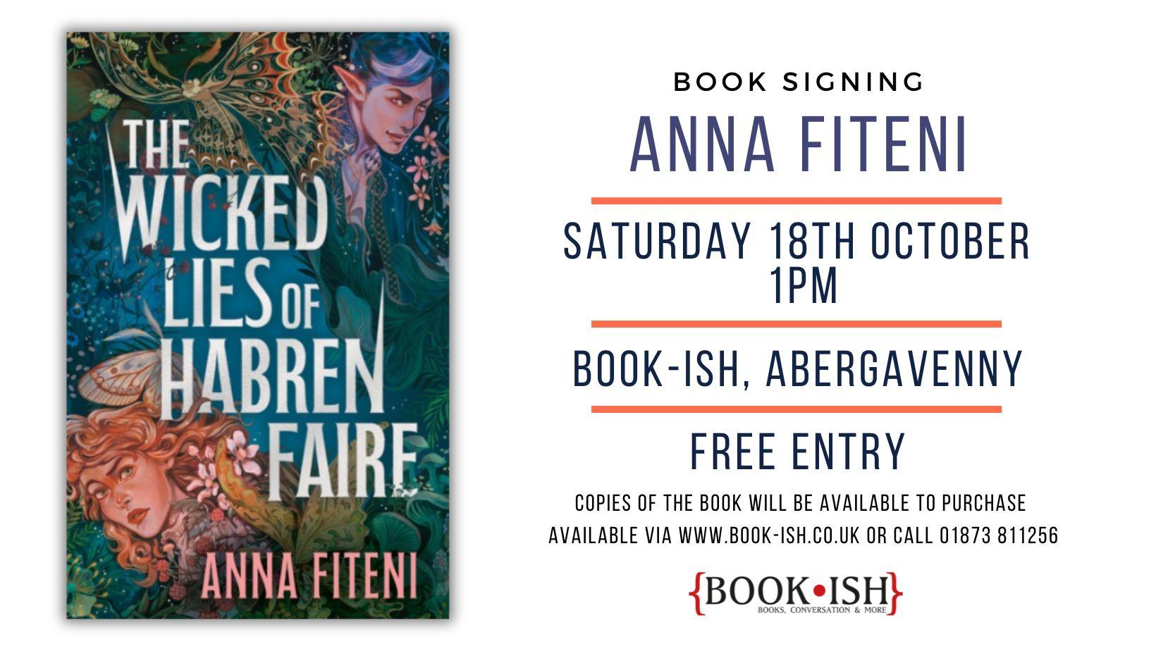 Join us at Book-ish Abergavenny at 1pm on Saturday 18th October for a book signing with Anna Fiteni. Books will be available to purchase, please book a free ticket to help us estimate attendance. About The Wicked Lies of Habren Faire Ceridwen Parry has run away with the fairies. But this is not her story. For Sabrina Parry, the world [...]